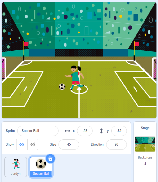 This time we will do a soccer player kicking the ball into a net. Your program will essentially be the same, except the backdrop, sprite for the player and sprite for the ball will be different, of course.