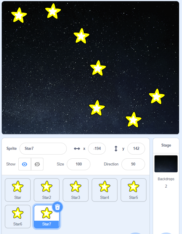 The Big Dipper is an asterism (lines that connect stars) in the constellation of Ursa Major (Latin for 'big bear') that we see in the night sky here in the Northern Hemisphere. Let's recreate it in Scratch.